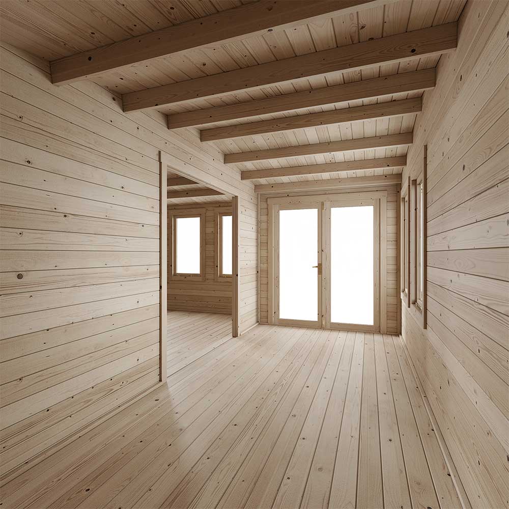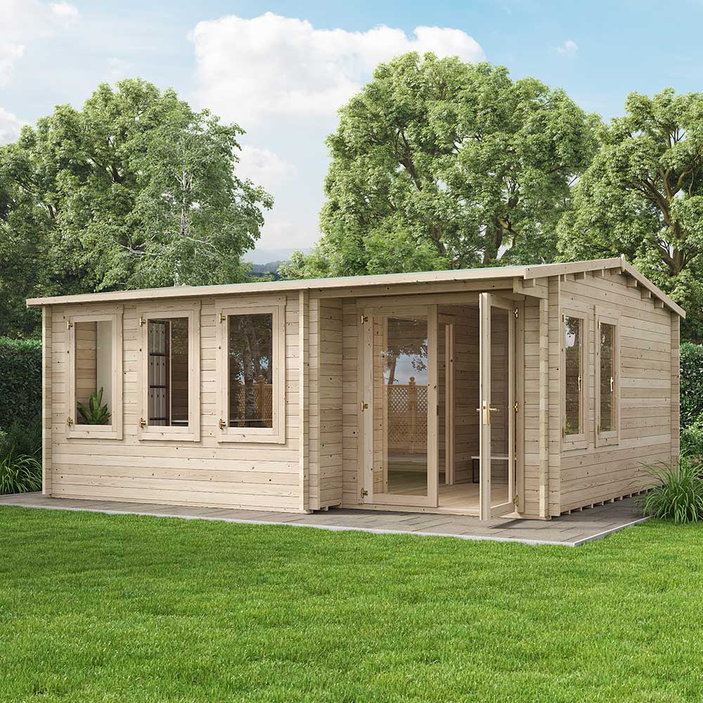 The Welbeck log cabin garden office from StoreMore is a modern and minimalist reverse-apex roof design that's a stunning and practical addition to any garden. Hand-crafted in the UK from solid 44mm interlocking tongue & groove log boards, this garden room is split into two good-sized areas offering an even more versatile interior, ideal as a garden office with a separate space to relax. There's no need for planning consentbeing under 2.5m in height.
